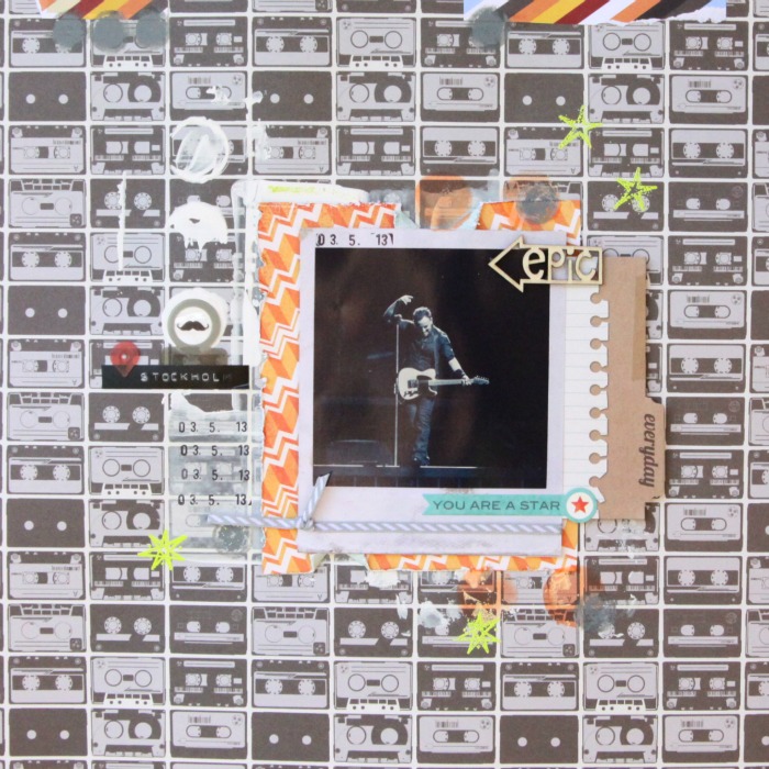 Material used: Patterned papers; Simple Stories for Cocoa Daisy (Record Label Elements #1). Echo Park All about a boy (Rough and Though). Embellishments; My Minds Eye Collectable Label stickers (You are a star). Basic Grey Hipster Die cut shapes (geotag & mustache). Frekled farm Word Bubbel Wood shapes (Epic). Zing embossing powder. Mayarts Ribbon. White gesso and Maya Road stamp ink.